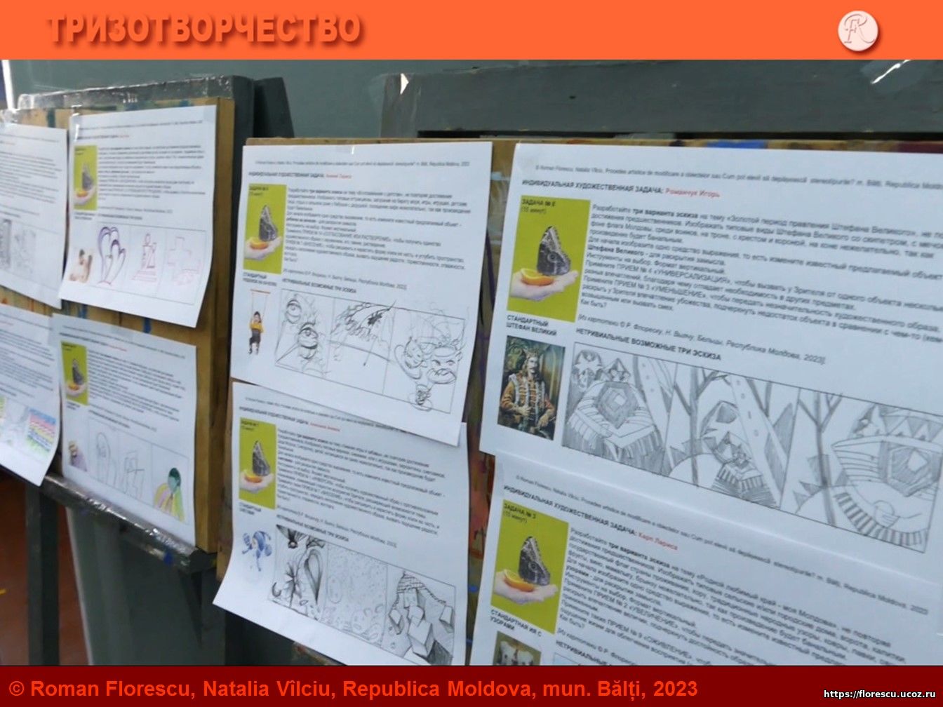 Фрагмент выставки индивидуальных решений Слушателей в конце семинара по поиску небанальных средств выражений с помощью 15 художественных приемов изменения объектов: 03.11.2023. Бельцы, Республика Молдова.