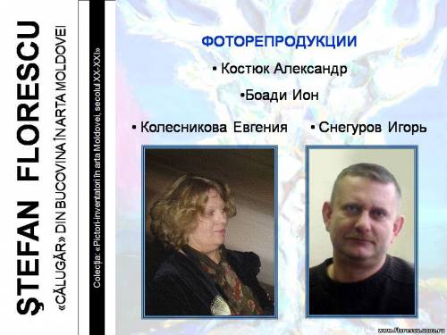 Представлены слайды 2007 года (г.г. Кишинёв и Бельцы, Молдова), демонстрировавшиеся на презентации книги Флореску Р. С. "ШТЕФАН ФЛОРЕСКУ: БУКОВИНСКИЙ «МОНАХ» В ИСКУССТВЕ МОЛДОВЫ. – Кишинёв: Полиграфический комбинат, 2006. – 132 с. – (Серия: «Художники-изобретатели в искусстве Молдовы ХХ-ХХI веков»), ISBN 978-9975-901-04-8, 1000 экз., 75/76(084.11)=135.1=161.1"