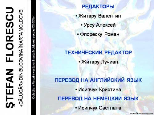 Представлены слайды 2007 года (г.г. Кишинёв и Бельцы, Молдова), демонстрировавшиеся на презентации книги Флореску Р. С. "ШТЕФАН ФЛОРЕСКУ: БУКОВИНСКИЙ «МОНАХ» В ИСКУССТВЕ МОЛДОВЫ. – Кишинёв: Полиграфический комбинат, 2006. – 132 с. – (Серия: «Художники-изобретатели в искусстве Молдовы ХХ-ХХI веков»), ISBN 978-9975-901-04-8, 1000 экз., 75/76(084.11)=135.1=161.1"
