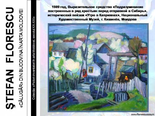 Представлены слайды 2007 года (г.г. Кишинёв и Бельцы, Молдова), демонстрировавшиеся на презентации книги Флореску Р. С. "ШТЕФАН ФЛОРЕСКУ: БУКОВИНСКИЙ «МОНАХ» В ИСКУССТВЕ МОЛДОВЫ. – Кишинёв: Полиграфический комбинат, 2006. – 132 с. – (Серия: «Художники-изобретатели в искусстве Молдовы ХХ-ХХI веков»), ISBN 978-9975-901-04-8, 1000 экз., 75/76(084.11)=135.1=161.1"