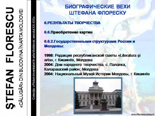 Представлены слайды 2007 года (г.г. Кишинёв и Бельцы, Молдова), демонстрировавшиеся на презентации книги Флореску Р. С. "ШТЕФАН ФЛОРЕСКУ: БУКОВИНСКИЙ «МОНАХ» В ИСКУССТВЕ МОЛДОВЫ. – Кишинёв: Полиграфический комбинат, 2006. – 132 с. – (Серия: «Художники-изобретатели в искусстве Молдовы ХХ-ХХI веков»), ISBN 978-9975-901-04-8, 1000 экз., 75/76(084.11)=135.1=161.1"