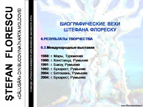 Представлены слайды 2007 года (г.г. Кишинёв и Бельцы, Молдова), демонстрировавшиеся на презентации книги Флореску Р. С. "ШТЕФАН ФЛОРЕСКУ: БУКОВИНСКИЙ «МОНАХ» В ИСКУССТВЕ МОЛДОВЫ. – Кишинёв: Полиграфический комбинат, 2006. – 132 с. – (Серия: «Художники-изобретатели в искусстве Молдовы ХХ-ХХI веков»), ISBN 978-9975-901-04-8, 1000 экз., 75/76(084.11)=135.1=161.1"