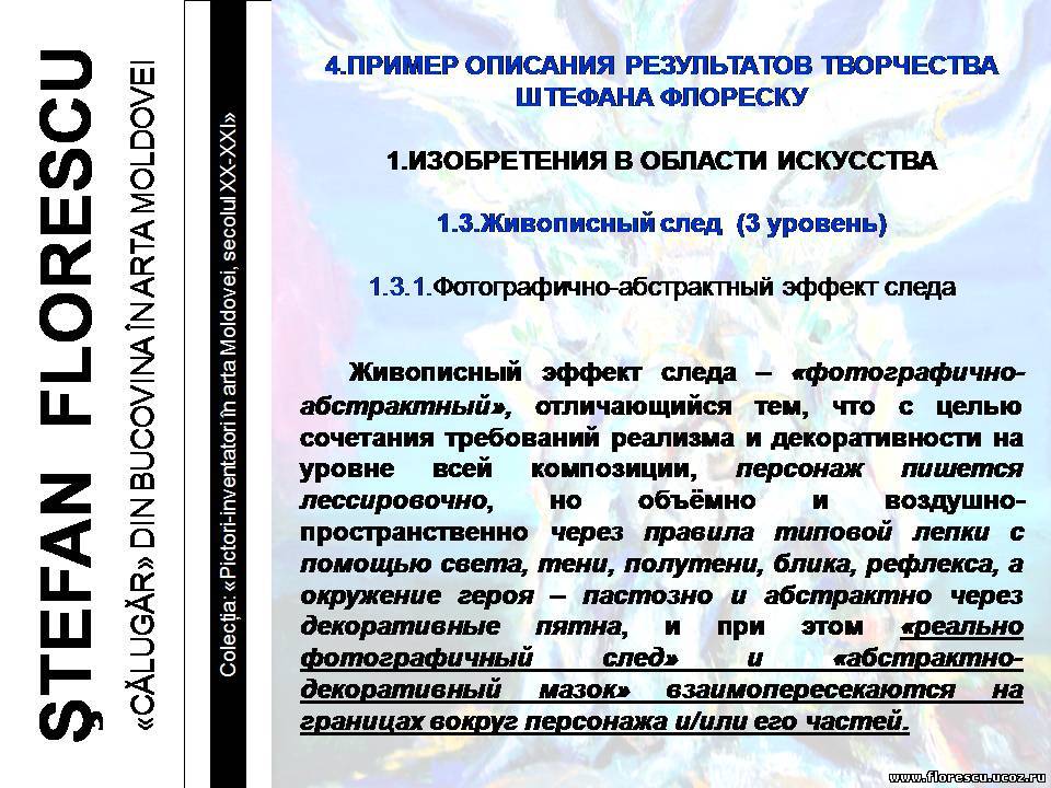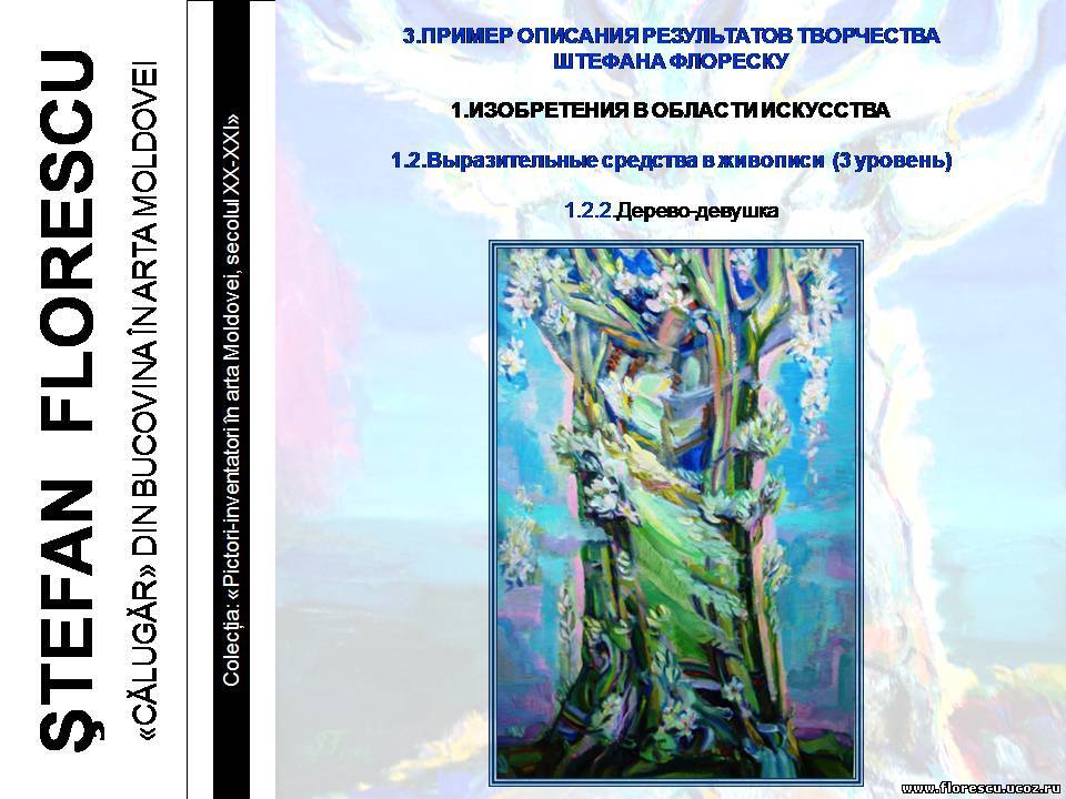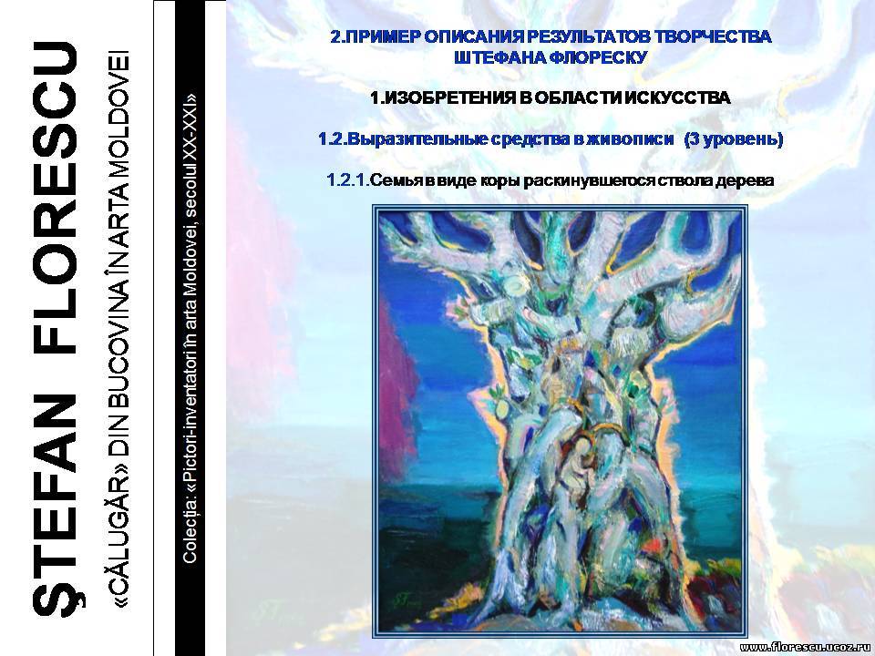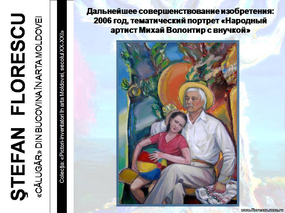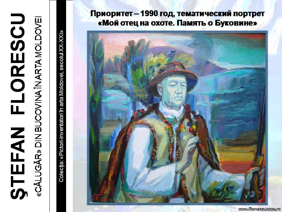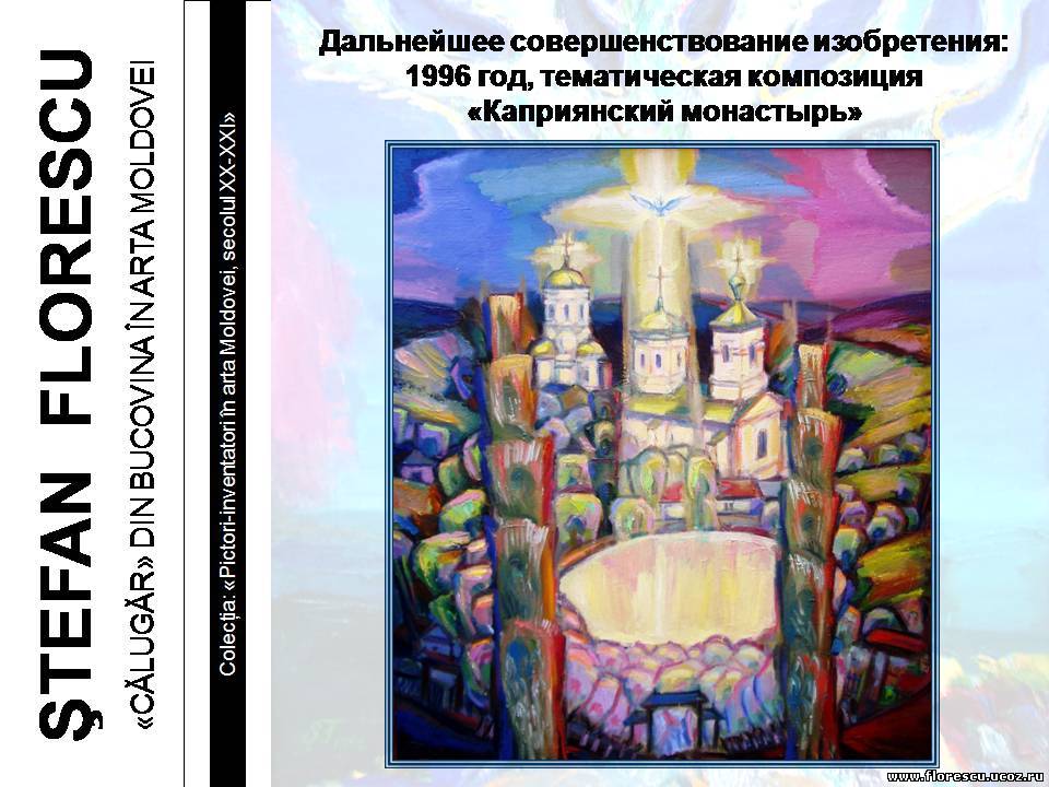 Представлены слайды 2007 года (г.г. Кишинёв и Бельцы, Молдова), демонстрировавшиеся на презентации книги Флореску Р. С. "ШТЕФАН ФЛОРЕСКУ: БУКОВИНСКИЙ «МОНАХ» В ИСКУССТВЕ МОЛДОВЫ. – Кишинёв: Полиграфический комбинат, 2006. – 132 с. – (Серия: «Художники-изобретатели в искусстве Молдовы ХХ-ХХI веков»), ISBN 978-9975-901-04-8, 1000 экз., 75/76(084.11)=135.1=161.1"