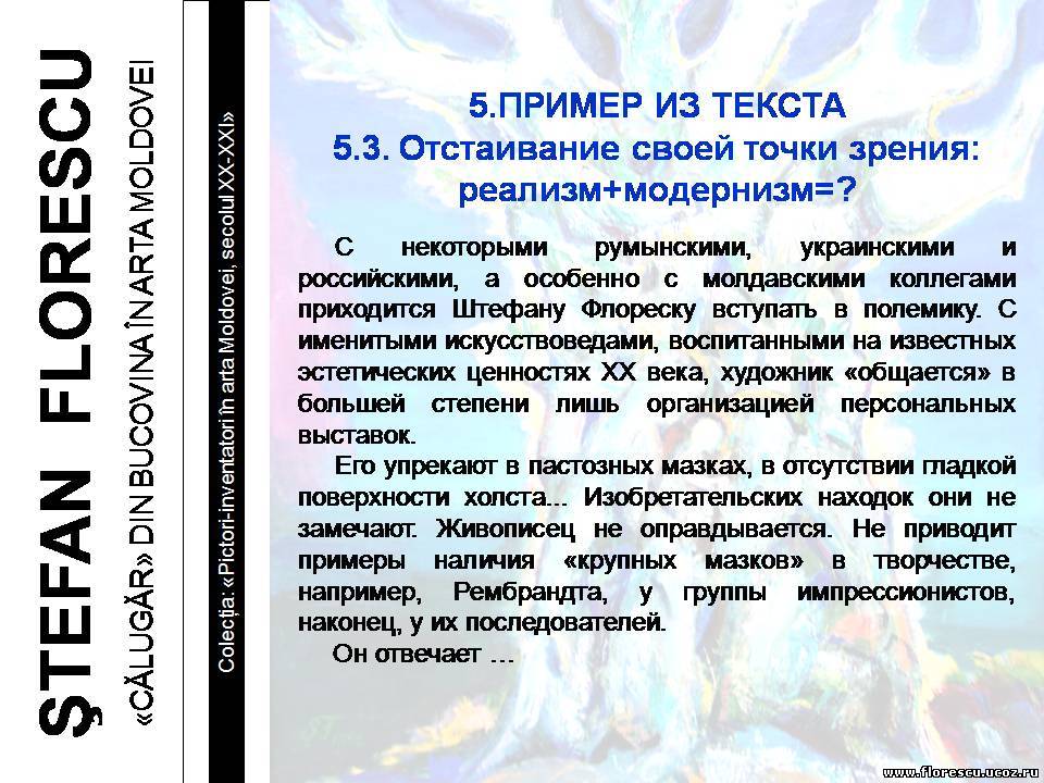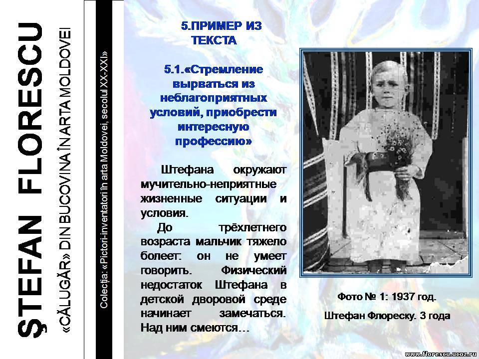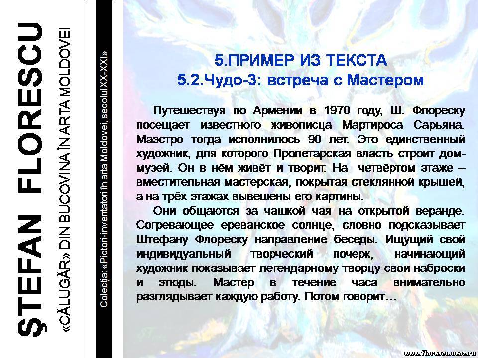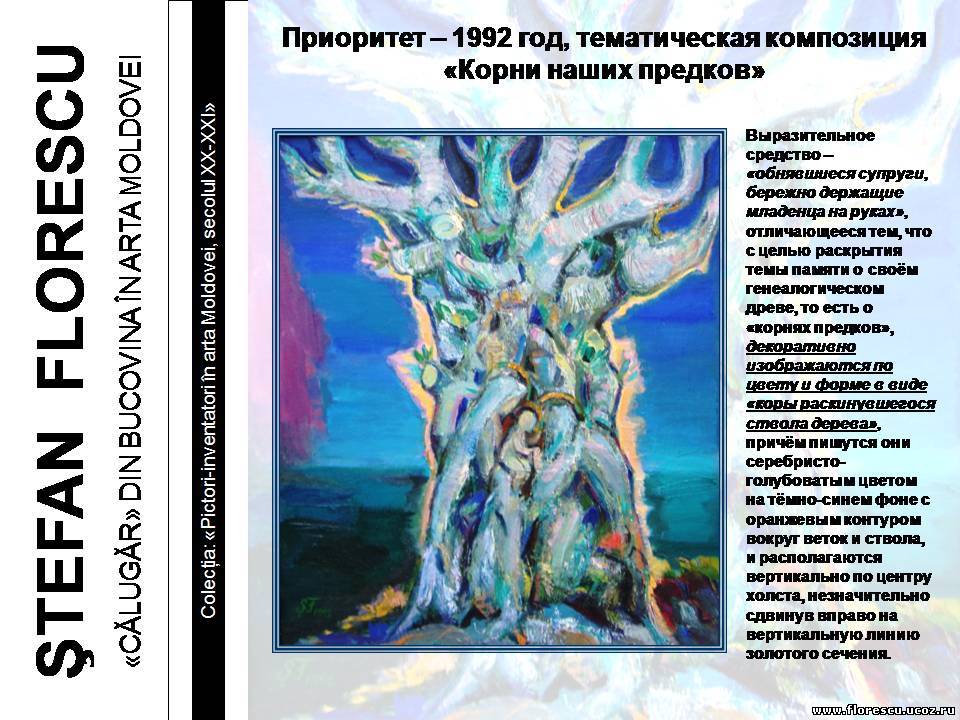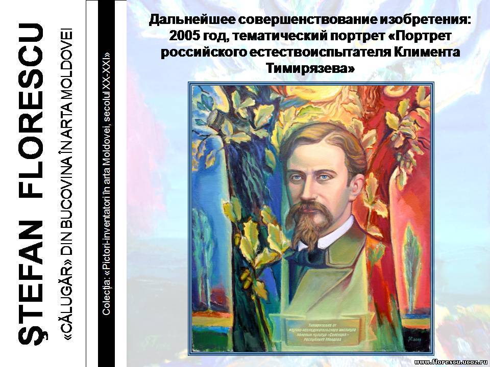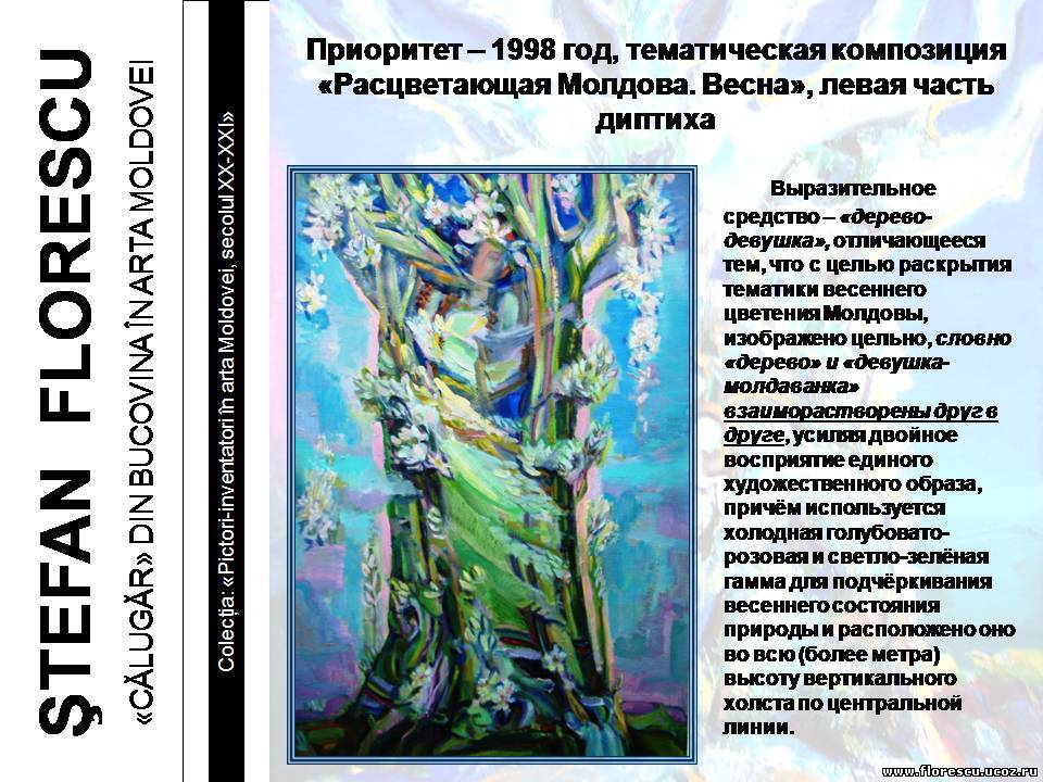 Представлены слайды 2007 года (г.г. Кишинёв и Бельцы, Молдова), демонстрировавшиеся на презентации книги Флореску Р. С. "ШТЕФАН ФЛОРЕСКУ: БУКОВИНСКИЙ «МОНАХ» В ИСКУССТВЕ МОЛДОВЫ. – Кишинёв: Полиграфический комбинат, 2006. – 132 с. – (Серия: «Художники-изобретатели в искусстве Молдовы ХХ-ХХI веков»), ISBN 978-9975-901-04-8, 1000 экз., 75/76(084.11)=135.1=161.1"