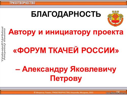 8 октября 2015 года (17:30-19:00) в рамках «Форума ткачей России» с 4 по 9 октября 2015 года (г. Чебоксары, Чувашская Республика, Россия), организованного для ста руководителей и мастеров ручного ткачества, проводился дистанционный ТРИЗ-тренинг по теме «Оценивание художественных идей», лектор – Флореску Роман Стефанович, Бельцы, Молдова (8 октября 2015 года, 17:30-19:00). БЛАГОДАРНОСТЬ Автору и инициатору проекта «ФОРУМ ТКАЧЕЙ РОССИИ» – Александру Яковлевичу Петрову.