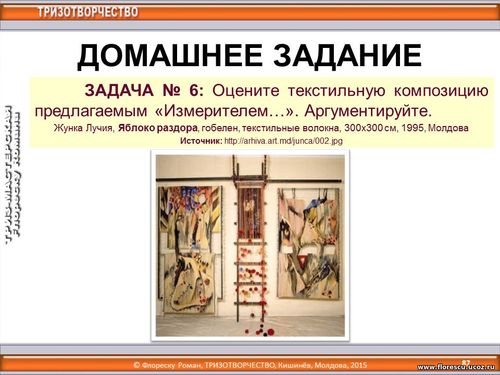8 октября 2015 года (17:30-19:00) в рамках «Форума ткачей России» с 4 по 9 октября 2015 года (г. Чебоксары, Чувашская Республика, Россия), организованного для ста руководителей и мастеров ручного ткачества, проводился дистанционный ТРИЗ-тренинг по теме «Оценивание художественных идей», лектор – Флореску Роман Стефанович, Бельцы, Молдова (8 октября 2015 года, 17:30-19:00). ЗАДАЧА № 6: Оцените текстильную композицию предлагаемым «Измерителем…». Аргументируйте. Жунка Лучия, Яблоко раздора, гобелен, текстильные волокна, 300x300 см, 1995, Молдова.