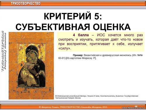 8 октября 2015 года (17:30-19:00) в рамках «Форума ткачей России» с 4 по 9 октября 2015 года (г. Чебоксары, Чувашская Республика, Россия), организованного для ста руководителей и мастеров ручного ткачества, проводился дистанционный ТРИЗ-тренинг по теме «Оценивание художественных идей», лектор – Флореску Роман Стефанович, Бельцы, Молдова (8 октября 2015 года, 17:30-19:00). КРИТЕРИЙ 5: СУБЪЕКТИВНАЯ ОЦЕНКА. 4 балла – ИОС хочется много раз смотреть и изучать, которая даёт что-то новое при восприятии, притягивает к себе, излучает «силу».