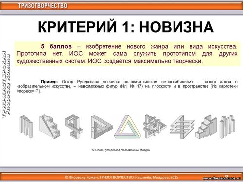 8 октября 2015 года (17:30-19:00) в рамках «Форума ткачей России» с 4 по 9 октября 2015 года (г. Чебоксары, Чувашская Республика, Россия), организованного для ста руководителей и мастеров ручного ткачества, проводился дистанционный ТРИЗ-тренинг по теме «Оценивание художественных идей», лектор – Флореску Роман Стефанович, Бельцы, Молдова (8 октября 2015 года, 17:30-19:00). КРИТЕРИЙ 1: НОВИЗНА. 5 баллов – изобретение нового жанра или вида искусства. Прототипа нет. ИОС может сама служить прототипом для других художественных систем. ИОС создаётся максимально творчески.