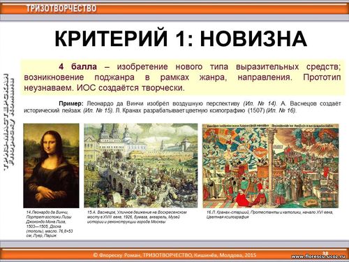 8 октября 2015 года (17:30-19:00) в рамках «Форума ткачей России» с 4 по 9 октября 2015 года (г. Чебоксары, Чувашская Республика, Россия), организованного для ста руководителей и мастеров ручного ткачества, проводился дистанционный ТРИЗ-тренинг по теме «Оценивание художественных идей», лектор – Флореску Роман Стефанович, Бельцы, Молдова (8 октября 2015 года, 17:30-19:00). КРИТЕРИЙ 1: НОВИЗНА. 4 балла – изобретение нового типа выразительных средств; возникновение поджанра в рамках жанра, направления. Прототип неузнаваем. ИОС создаётся творчески.