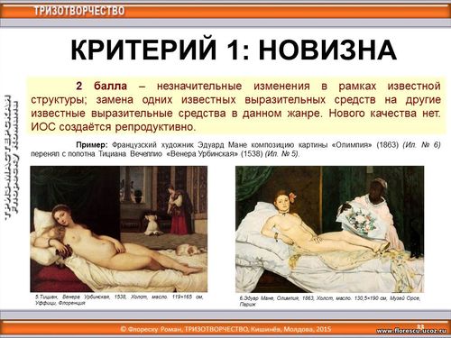 8 октября 2015 года (17:30-19:00) в рамках «Форума ткачей России» с 4 по 9 октября 2015 года (г. Чебоксары, Чувашская Республика, Россия), организованного для ста руководителей и мастеров ручного ткачества, проводился дистанционный ТРИЗ-тренинг по теме «Оценивание художественных идей», лектор – Флореску Роман Стефанович, Бельцы, Молдова (8 октября 2015 года, 17:30-19:00). КРИТЕРИЙ 1: НОВИЗНА. 2 балла – незначительные изменения в рамках известной структуры; замена одних известных выразительных средств на другие известные выразительные средства в данном жанре. Нового качества нет. ИОС создаётся репродуктивно.