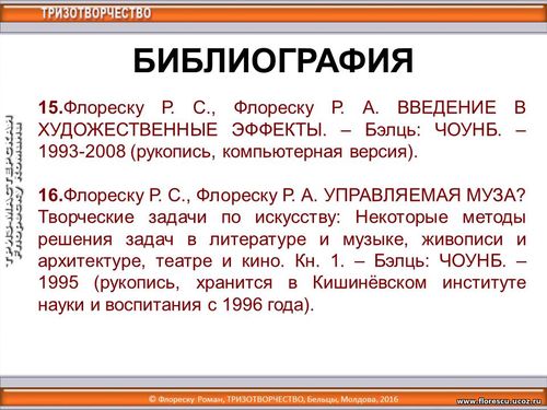 2 октября 2016 года (19:00-20:00) в рамках «Форума ткачей России» с 1 по 6 октября 2016 года (г. Чебоксары, Чувашская Республика, Россия), организованного для ста руководителей и мастеров ручного ткачества, проводился дистанционный ТРИЗ-тренинг по теме «Стратегический инструмент развития творческих способностей или как диагностировать уровень творчества и восходить дальше», лектор – Флореску Роман Стефанович, Бельцы, Молдова (2 октября 2016 года, 19:00-20:00). БИБЛИОГРАФИЯ.
