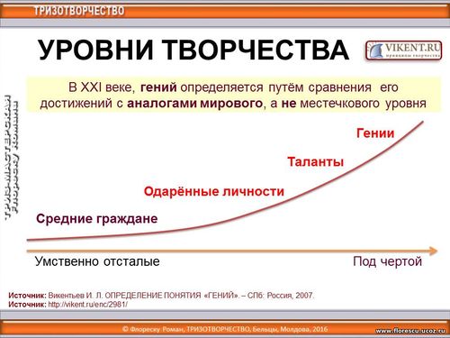 2 октября 2016 года (19:00-20:00) в рамках «Форума ткачей России» с 1 по 6 октября 2016 года (г. Чебоксары, Чувашская Республика, Россия), организованного для ста руководителей и мастеров ручного ткачества, проводился дистанционный ТРИЗ-тренинг по теме «Стратегический инструмент развития творческих способностей или как диагностировать уровень творчества и восходить дальше», лектор – Флореску Роман Стефанович, Бельцы, Молдова (2 октября 2016 года, 19:00-20:00). УРОВНИ ТВОРЧЕСТВА.