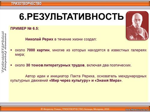 2 октября 2016 года (19:00-20:00) в рамках «Форума ткачей России» с 1 по 6 октября 2016 года (г. Чебоксары, Чувашская Республика, Россия), организованного для ста руководителей и мастеров ручного ткачества, проводился дистанционный ТРИЗ-тренинг по теме «Стратегический инструмент развития творческих способностей или как диагностировать уровень творчества и восходить дальше», лектор – Флореску Роман Стефанович, Бельцы, Молдова (2 октября 2016 года, 19:00-20:00). 6.Результативность.
