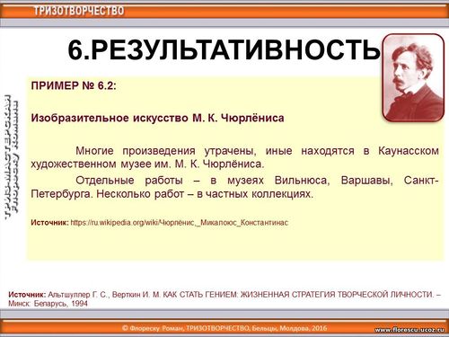 2 октября 2016 года (19:00-20:00) в рамках «Форума ткачей России» с 1 по 6 октября 2016 года (г. Чебоксары, Чувашская Республика, Россия), организованного для ста руководителей и мастеров ручного ткачества, проводился дистанционный ТРИЗ-тренинг по теме «Стратегический инструмент развития творческих способностей или как диагностировать уровень творчества и восходить дальше», лектор – Флореску Роман Стефанович, Бельцы, Молдова (2 октября 2016 года, 19:00-20:00). 6.Результативность.