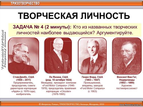 2 октября 2016 года (19:00-20:00) в рамках «Форума ткачей России» с 1 по 6 октября 2016 года (г. Чебоксары, Чувашская Республика, Россия), организованного для ста руководителей и мастеров ручного ткачества, проводился дистанционный ТРИЗ-тренинг по теме «Стратегический инструмент развития творческих способностей или как диагностировать уровень творчества и восходить дальше», лектор – Флореску Роман Стефанович, Бельцы, Молдова (2 октября 2016 года, 19:00-20:00). ЗАДАЧА № 4 (2 минуты): Кто из названных творческих личностей наиболее выдающийся? Аргументируйте.