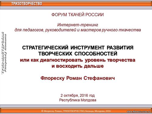 2 октября 2016 года (19:00-20:00) в рамках «Форума ткачей России» с 1 по 6 октября 2016 года (г. Чебоксары, Чувашская Республика, Россия), организованного для ста руководителей и мастеров ручного ткачества, проводился дистанционный ТРИЗ-тренинг по теме «Стратегический инструмент развития творческих способностей или как диагностировать уровень творчества и восходить дальше», лектор – Флореску Роман Стефанович, Бельцы, Молдова (2 октября 2016 года, 19:00-20:00).